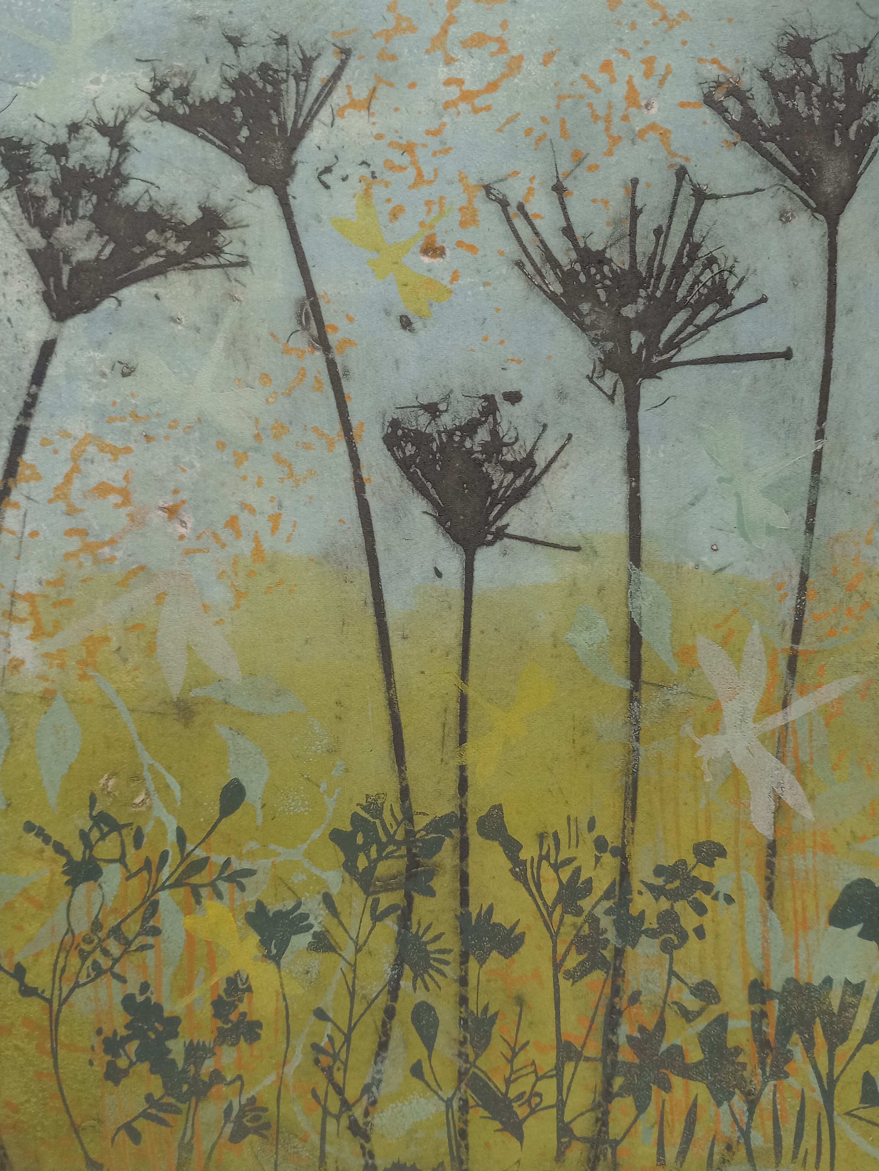 A mixed technique print of mono and solarprints, I collected plants from Wighton church this Spring, created solar plates and printed them onto monoprinted paper, now hanging in the exhibition, opening 3rd July to 3rd August 2025, open daily.
